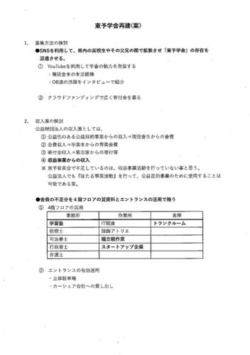 東予育英会役員 意見交換会 vol.3日時:2024年12月17日 19:00~20:00 場所:東予学舎舎友会室出席者:会長、副会長、前田評議員、西部評議員、鈴木評議員、学舎運営委員4名◇主な発言内容(発言者名は割愛する)1)これまでの議論は、ただ舎生数を増やすのみ…